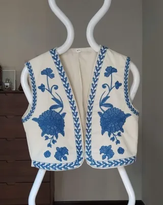 Chaleco de mujer con bordados estilo boho talla XS, ideal para añadir un toque único a tu estilo. Es una prenda nueva, perfecta para combinar con diferentes outfits. - Diseño con bordados florales en azul. - Tela color crema. - Corte chaleco abierto. ✨ Nuevo a estrenar. Moda tendencia actual bonita atemporal