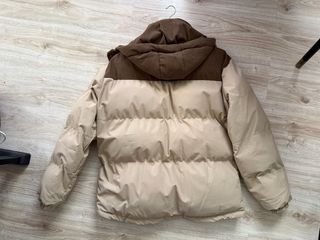 Abrigo acolchado con diseño moderno. Tipo ancho, oversize. Tipo plumífero. Para persona alta o grande (1,80). PUESTO 1 VEZ. - Parte superior de pana marrón. - Cuerpo principal en color beige. - Bolsillos laterales con detalle de pana.