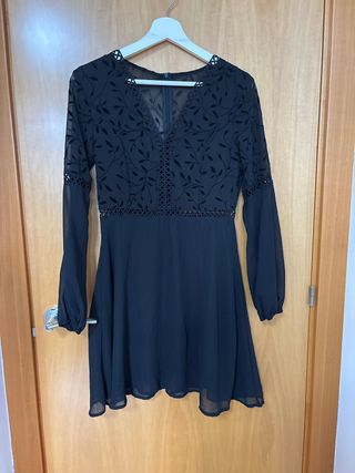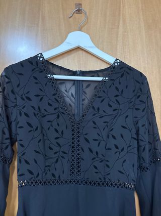 Vestido negro de Shein con un diseño elegante y detalles de terciopelo - Mangas largas transparentes - Escote en V. - Cintura con detalle de encaje. - Falda con caída.