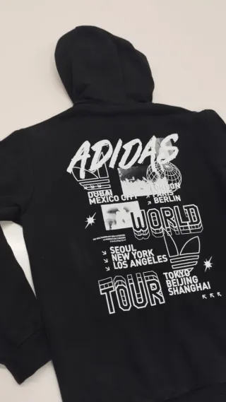 Sudadera con capucha de Adidas. Presenta un diseño gráfico en el pecho. - Diseño gráfico con un globo terráqueo y texto Adidas World Tour. - Logo de Adidas en la etiqueta interior.