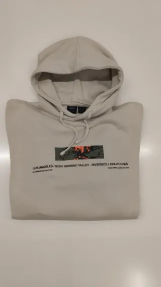 Sudadera para niño con capucha de Pull&Bear en color beige. Presenta un diseño gráfico en la parte frontal. - Estampado con texto: LOS ANGELES / 92551 MORENO VALLEY - RIVERSIDE / CALIFORNIA - Detalle de ALTERNATIVE CULTURE y PUNK MAGAZINE 02/100.