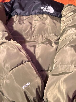 Chaqueta acolchada The North Face con un diseño bicolor. - Parte superior en negro. - Cuerpo principal en verde. - Detalle 700 en la manga.