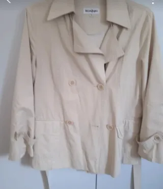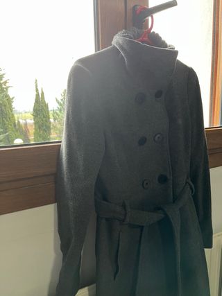 Abrigo largo de color beige, en perfecto estado. - Diseño tipo gabardina. - Cinturón para ajustar a la cintura. - Cierre cruzado.