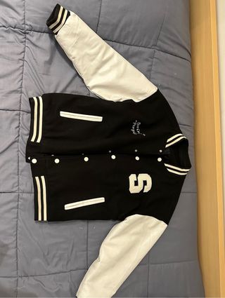 Chaqueta estilo beisbolera, usada una sola vez. - Diseño de dos tonos: cuerpo negro y mangas blancas. - Puños y cuello con detalles de rayas blancas. - Cierre de botones a presión. - Número 5 bordado en la parte frontal.
