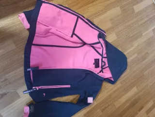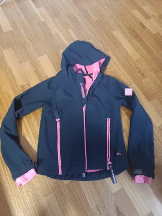 Chaqueta de montaña con forro polar para niña, tipo cortavientos. No impermeable pero sí muy cómoda para llevar capas, gracias a su tejido elástico. Marca Tenth (Decimas). Con capucha y cremalleras en los bolsillos. En muy buenas condiciones