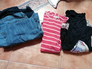 Conjunto de ropa premamá. - Pantalones vaqueros talla 48 - Camiseta de rayas rosas talla S. - Camiseta negra con estampado floral.