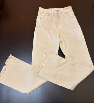 Vaqueros de talle alto en color beige. Presentan un diseño moderno con los bajos desflecados. - Cintura alta. - Bajo desflecado.