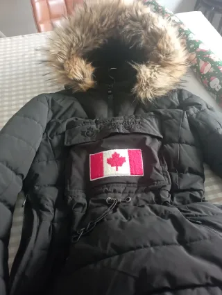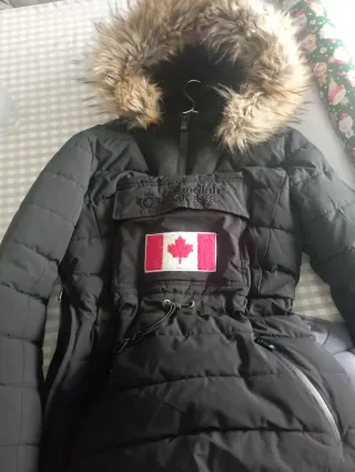 Chaqueta de la marca Canadian en perfecto estado. Diseño moderno y funcional. - Color negro. - Capucha con pelo. - Bolsillo frontal con parche de la bandera de Canadá. - Cordón ajustable en la cintura.