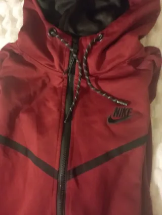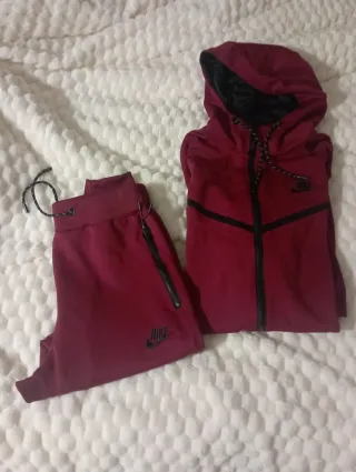 Conjunto de chándal Nike en color rojo y negro. - Cremallera completa en la chaqueta. - Capucha ajustable con cordones. - Bolsillos con cremallera en los pantalones. - Logo de Nike bordado.