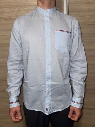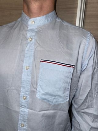 Camisa de manga larga con cuello mao y detalles en puños y bolsillo. - Color azul claro. - Cierre de botones. - Diseño moderno y casual.