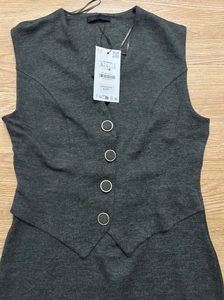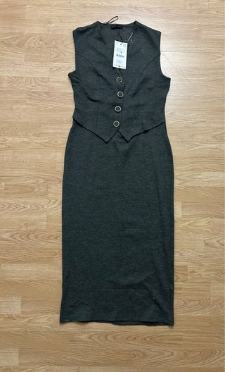 Vestido de Zara con un diseño elegante y moderno. Combina un corte de chaleco con una falda lápiz. - Chaleco incorporado con cuello en pico. - Cierre de botones frontales. - Falda de corte recto hasta la rodilla.