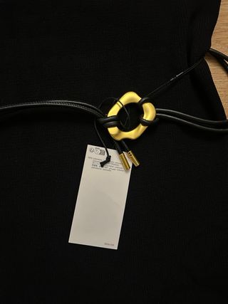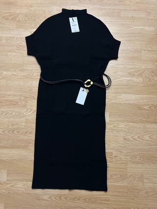 Elegante vestido midi de Zara en color negro. Presenta un diseño moderno con cuello alto y mangas cortas tipo capa. Incluye un cinturón a juego con hebilla dorada. - Tejido de punto. - Largo midi. - Cinturón con detalle dorado.