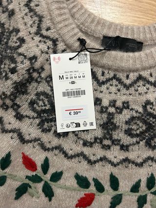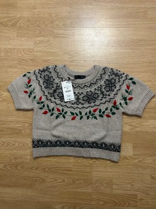 Jersey de Zara con un diseño llamativo y estampado. - Diseño de cuello redondo. - Mangas cortas. - Estampado floral y geométrico. - Acabado en canalé en puños y bajo.