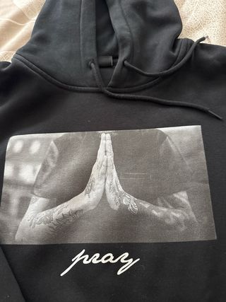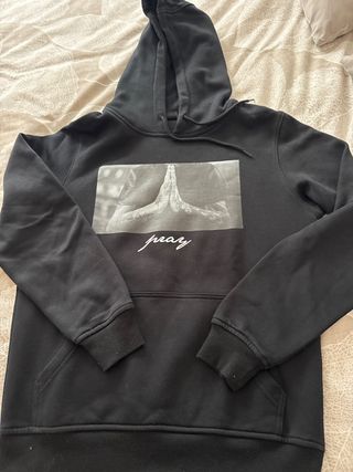 Sudadera negra con estampado gráfico de manos rezando y la palabra pray. - Diseño frontal con imagen en blanco y negro. - Puños y cintura elásticos.