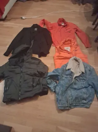 Conjunto de prendas de abrigo de diferentes marcas. - Chaqueta negra. - Chaqueta naranja. - Chaleco naranja. - Chaqueta vaquera con forro.