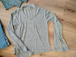 Conjunto de prendas de vestir para mujer. - Jersey corto azul grisáceo pull&bear S - Blusa gris con mangas acampanadas Easy Wear S - Pantalón vaquero azul talla 36 - Jerseys blanco y rosa