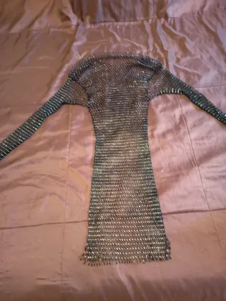 Prenda de malla con detalles plateados y negros, ideal para eventos. - Diseño de manga larga. - Tejido de malla. - Largo hasta la cadera.