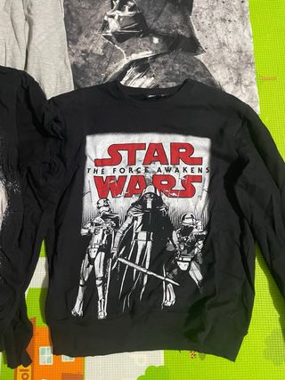 Conjunto de cuatro prendas de ropa con temática de Star Wars. - Sudadera gris con Darth Vader. - Camiseta gris jaspeada con Darth Vader. - Camiseta negra con Stormtrooper. - Sudadera negra con personajes de The Force Awakens. Todo talla M Ropa usada pero bien conservada