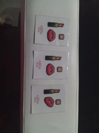 Set de adhesivos con diseño de labial y labios. - Incluye tres diseños. - Cada diseño tiene un labial, unos labios y el logo de Chanel. Vengo cada pack x 15 euros