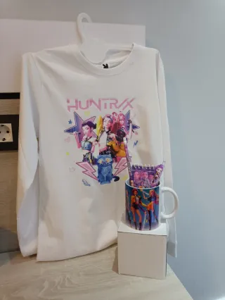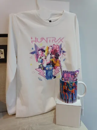 Conjunto de camiseta de manga larga y taza con diseño Huntrix. Camisetas en todas las tallas desde 5 hasta 12 años. La taza incluye material escolar Huntrix - Camiseta blanca con estampado. - Taza con diseño a juego.