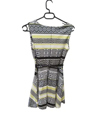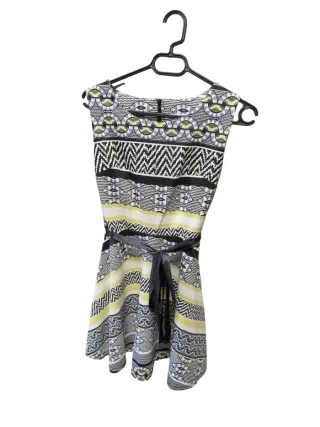 Vestido con un diseño vibrante y llamativo. Perfecto para cualquier ocasión. - Estampado geométrico y tribal. - Cinturón de tela a juego. - Corte evasé.