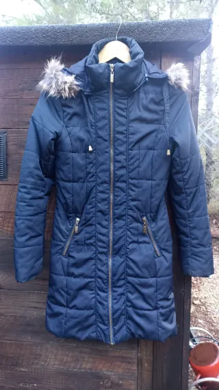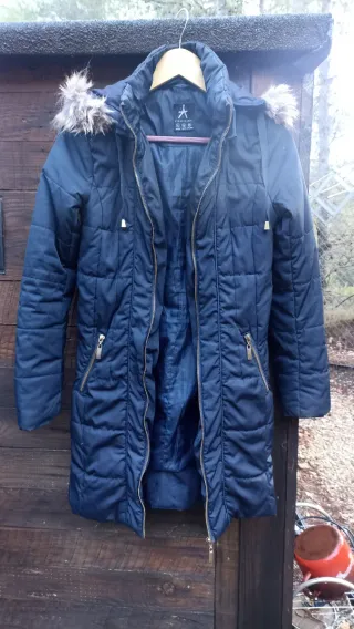 Abrigo largo de la marca Atmosphere de primark azul marino Talla 34 - Capucha con detalle de pelo - Cierre de cremallera frontal. - Bolsillos laterales con cremallera. - Diseño acolchado.