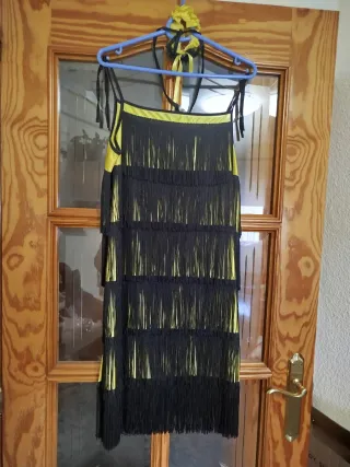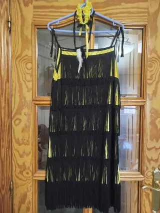 Vestido estilo flapper con flecos y detalles brillantes. - Diseño de tirantes. - Flecos en cascada. - Adorno de pluma blanca.