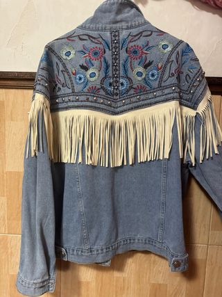 Chaqueta vaquera con un diseño único y llamativo. SIN ESTRENAR. con etiqueta - Detalles bordados florales en la espalda. - Adornos de flecos en los hombros y la parte superior. - Tachuelas metálicas decorativas.