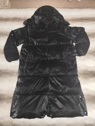 Abrigo largo acolchado con capucha oversize. - Diseño brillante. - Cierre de botones. - Bolsillos laterales.