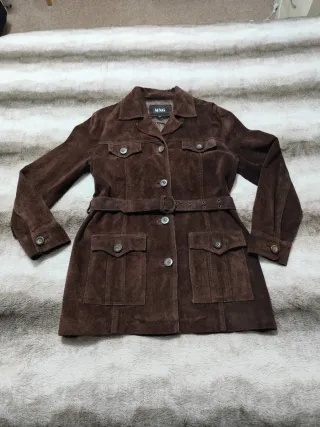 Chaqueta de ante de Mango en color marrón. Un básico para tu armario. -Piel auténtica - Diseño con cinturón. - Bolsillos frontales con solapa. - Cierre de botones.
