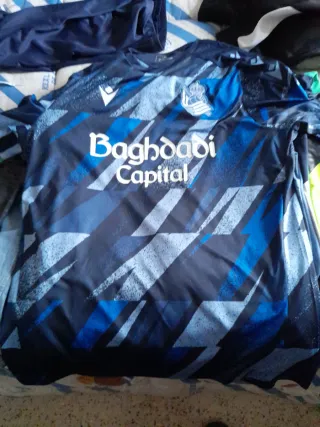 Camiseta de calentamiento de la Real Sociedad. - Diseño con estampado dinámico en tonos azules y blancos. - Logo de Macron en la manga. - Escudo del club en el pecho.