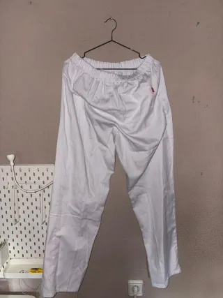 Camisa de manga corta Talla XL, un pantalón negro talla L, otro pantalón de cuadros blanco y negro, un gorro negro y un delantal negro