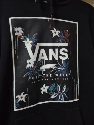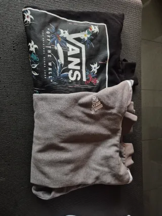 Conjunto de prendas de vestir para hombre. - Sudadera negra con estampado floral y logo Vans. - Sudadera gris con logo Adidas.