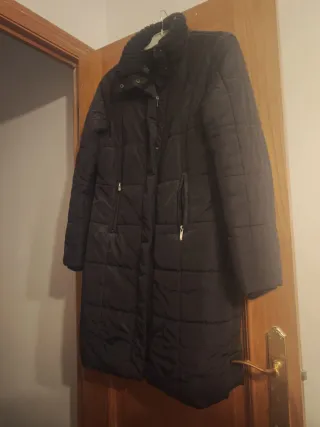 Abrigo largo acolchado de Zara. - Cuello alto con acabado de punto. - Cierre de cremallera. - Bolsillos laterales con cremallera.