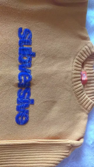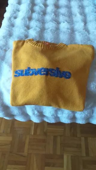 Jersey de punto con diseño bordado. El color es el de la primera foto. - Color principal amarillo. - Detalle bordado en azul con la palabra subversive. - Cuello redondo acanalado.