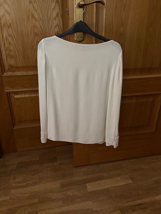 Elegante camisa de Massimo Dutti en color blanco roto. Presenta un diseño sofisticado con detalles en las mangas. - Manga larga con botones decorativos en el puño. - Cuello redondo. - Corte recto.
