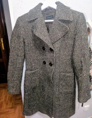 Elegante abrigo de paño con doble botonadura. - Diseño clásico con solapas. - Dos bolsillos frontales. - Botones dorados. - Forro interior.