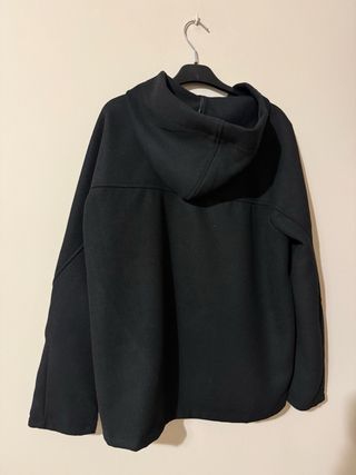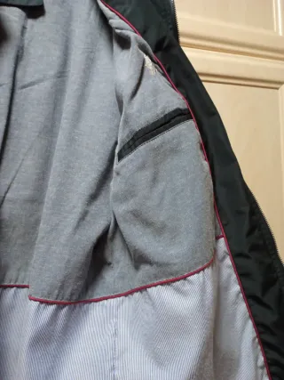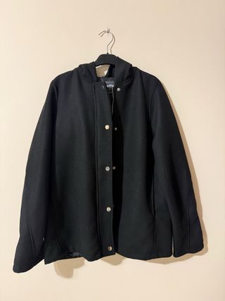 Abrigo fino de color negro, ideal para entretiempo. Presenta un diseño moderno y versátil. - Cierre de botones a presión. - Bolsillos laterales. - Capucha integrada. No tiene etiqueta, pero no me lo he puesto nunca, es finito.