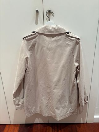 Chaqueta tipo gabardina corta de la marca Green en color blanco. Esta prenda presenta un diseño clásico y estructurado, ideal para un look sofisticado de entretiempo. Cuenta con un cierre frontal de doble botonadura con botones metálicos grabados, cuello de solapa y charreteras en los hombros. El diseño incluye un cinturón a juego para ajustar la cintura y estilizar la figura, además de prácticos bolsillos laterales con cierre de cremallera metálica vista. Detalles: Botones decorativos y cinturón ajustable El envío se realiza de manera inmediata en un plazo de 24/48 horas. En nuestra cuenta de Vinted se pueden comprar directamente...