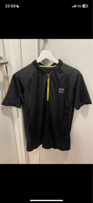 Camiseta deportiva de manga corta con cremallera frontal. - Diseño con detalles de rombos en los hombros. - Logo de EA7 Emporio Armani en el pecho. - Cremallera amarilla. - Cuello redondo.