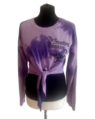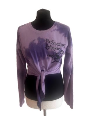 Camiseta de manga larga tipo top con efecto tie dye en tonos morados, algodón 100% Estampado The Smashing Pumpkins en el pecho y en la espalda. Tallas M de Zara. Medidas: largo de manga 56 cm, largo 44 cm, espalda 53 cm, pecho 98 cm.
