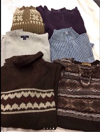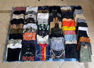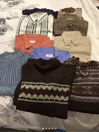Lote de ropa variada para hombre, con prendas de diferentes estilos y colores. Tallas jerséis (M), pantalones (36, 38), blazer (48) - Incluye camisetas, jerséis, pantalones y bermudas. - Algunas prendas son de marcas reconocidas. - Ideal para renovar tu armario con variedad.