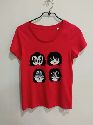 Camiseta de manga corta para mujer - Algodón orgánico - Tejido preencogido - Estampado Kiss en la parte delantera (dtg) - Cuello redondo. - Corte suelto medium fit - Alto: 62cm - Ancho: 42cm