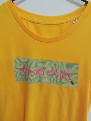Camiseta de manga corta para mujer - Algodón orgánico - Tejido preencogido - Estampado Rock and Roll Girl en la parte delantera (dtg) - Cuello redondo. - Corte suelto medium fit - Alto: 62cm - Ancho: 42cm