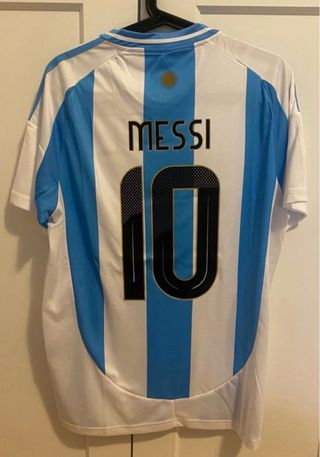Camiseta de la selección argentina de fútbol. FIFA 2022 - Diseño clásico con franjas verticales. - Detalles dorados. - Número 10 en la parte frontal.