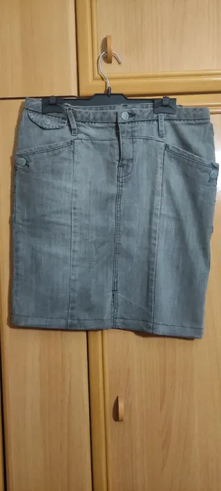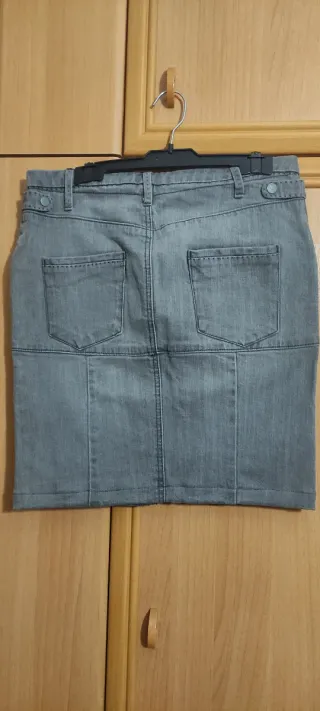 Minifalda tejana de corte recto. - Diseño de cinco bolsillos. - Cierre de cremallera y botón. - Costuras decorativas. - largo 48 cm