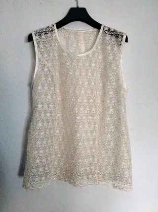 Elegante blusa sin mangas con un delicado diseño de encaje floral. - Tejido de encaje con motivos florales. - Acabado con borde festoneado. - Cuello redondo.
