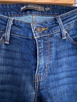 Vaqueros de corte clásico para mujer. Modelo slight curve modern rise, straight 8/29. Se han usado pero están muy bien cuidados. Mínimo desgaste en la entrepierna que se ve en la foto. He puesto talla 40 porqué no encuentro la equivalencia de la talla 29 de levi’S. 99% algodon 1% elastano