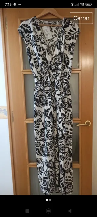 Mono largo con un bonito estampado floral en blanco y negro. Es una prenda elegante y cómoda. - Diseño con escote en V. - Cintura elástica para un mejor ajuste. - Mangas cortas tipo casquillo.