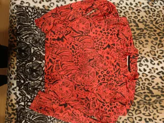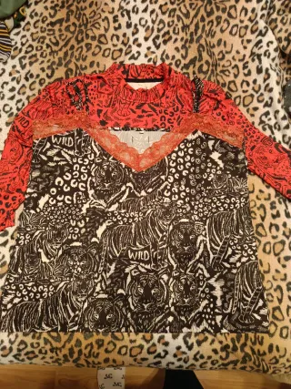 Conjunto de dos prendas de ropa: una camiseta lencera talla XL y una camiseta de manga larga talla L amplia Crop top - Diseño con estampado de tigres y leopardo. - Detalles de encaje en la zona del escote. - Mangas largas.